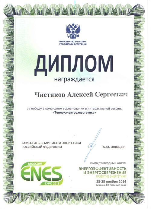 Студент группы ЭХП-1-13 Чистяков Алексей награжден ДИПЛОМОМ за победу в командном соревновании в интерактивной сессии "Тепло/электроэнергетика", проходившем на V Международном форуме "ЭНЕРГОЭФФЕКТИВНОСТЬ И ЭНЕРГОСБЕРЕЖЕНИЕ. Развитие энергетики" с 23-25 ноября 2016 г. в г. Москва
