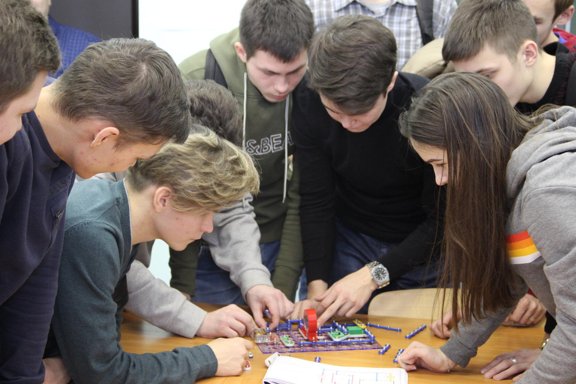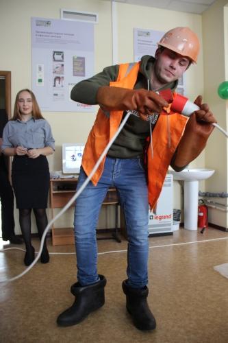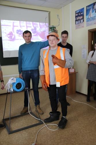 Далее новичкам предлагалось перевоплотиться в действующих энергетиков и произвести подключение электродвигателя, пройдя через созданные старшекурсниками препятствия. Первокурсников в темном коридоре облачали в защитный жилет электрика, каску, диэлектрические рукавицы и боты, раскрутили, одновременно задавая тематические вопросы, и отправляли в аудиторию, где пройдя через тоннель, необходимо было произвести подключение и пуск трехфазного двигателя.