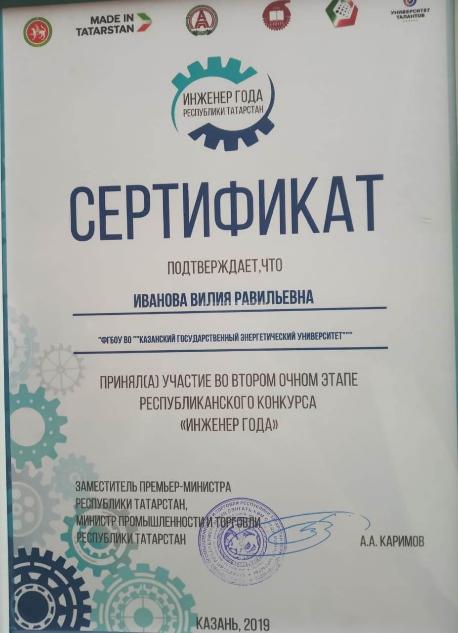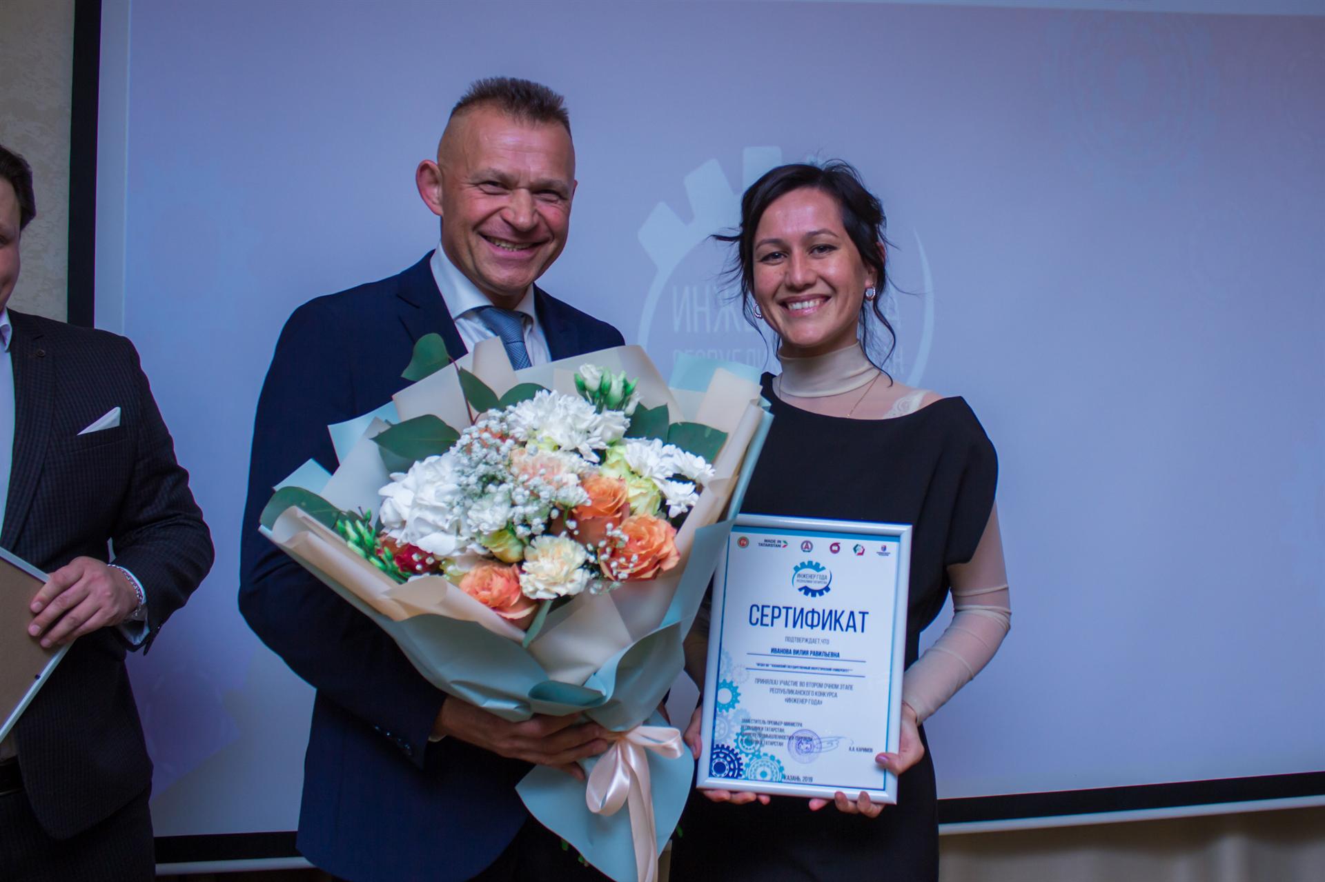 Заместитель министра промышленности и торговли Республики Татарстан Савельчев Алексей Петрович вручает Сертификат доценту кафедры ЭХП КГЭУ Ивановой Вилии Равильевне
