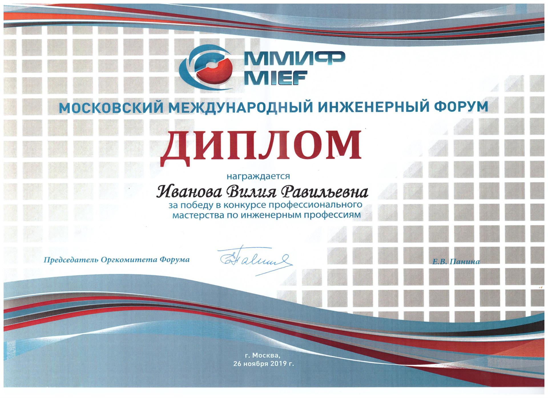 В рамках VII Московского международного инженерного форума был проведен конкурс профессионального мастерства по инженерным профессиям, в результате которого Иванова Вилия Равилевна была награждена дипломом Победителя. Поздравляем!