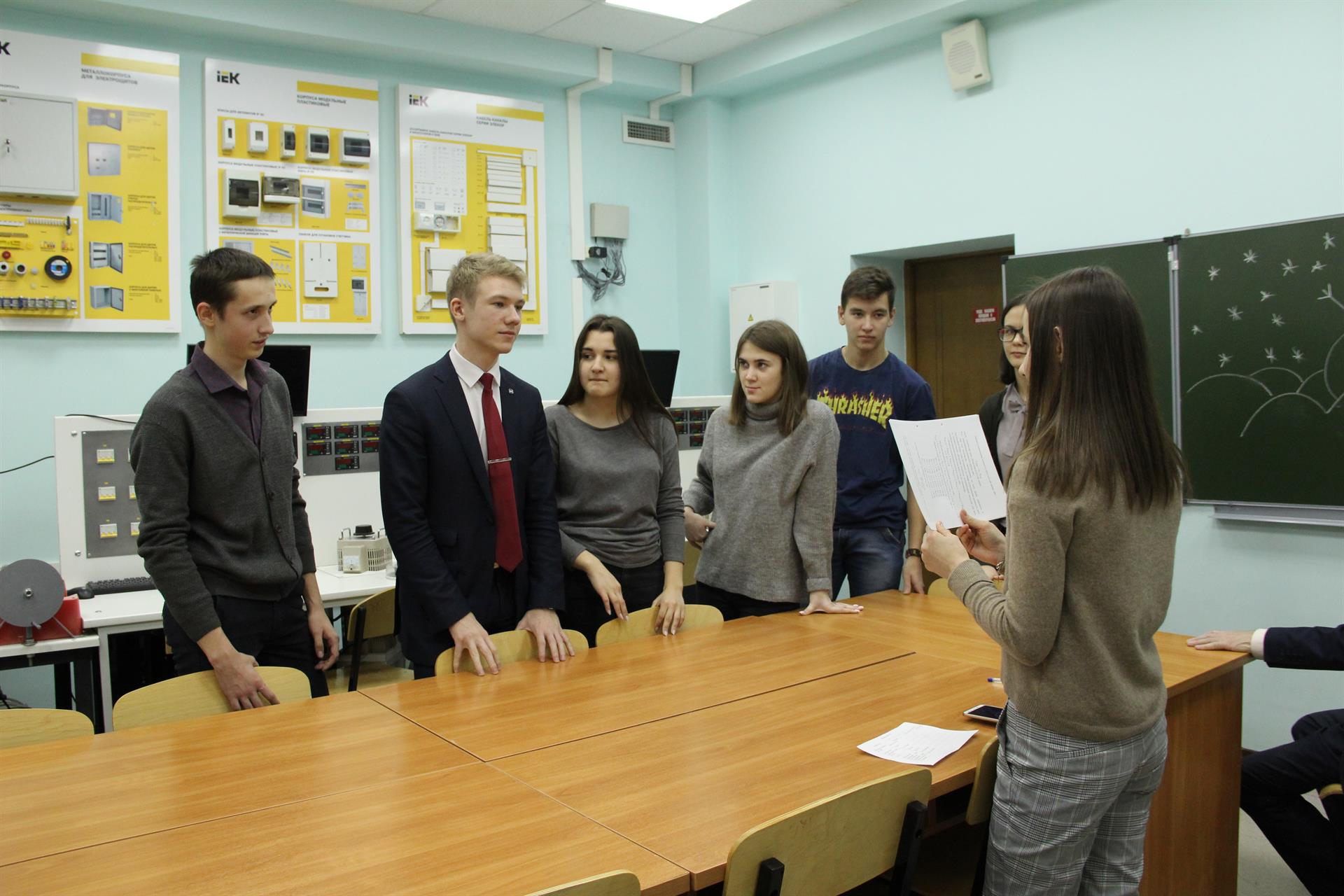 Но и это - не главная часть программы. На финальной станции первокурсников ждала целая полоса препятствий: по одному каждого запускают в помещение, там в процессе экипировки в спецодежду идёт опрос по формулам и законам, затем их запускают в тоннель, по которому уже в полном снаряжении им нужно протащить розетку или предохранитель и установить к устройству.