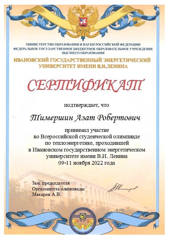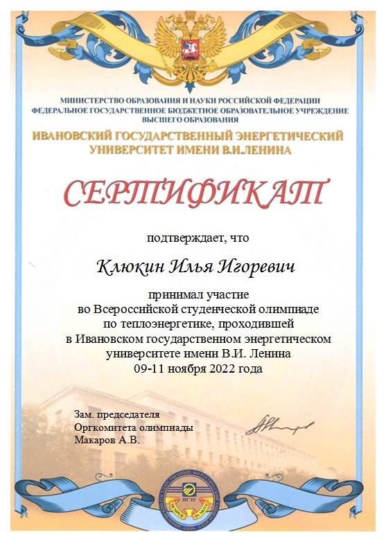 Участники Олимпиады соревновались в командной интеллектуальной игре по теплоэнергетике и решении задач. От КГЭУ в олимпиаде по теплоэнергетике приняли участие студенты Института теплоэнергетики Кашаева Алина, Тимершин Азат, Шарафиев Дмитрий, Тарабаева Дарья, Клюкин Илья и сопровождающий их доцент кафедры ПТЭ Валиев Радик Нурттинович. По итогам проверки олимпиадных работ студенты кафедры «Промышленная теплоэнергетика и системы теплоснабжения» Казанского государственного энергетического университета Кашаева Алина, Тимершин Азат, Шарафиев Дмитрий были награждены дипломом за 3-е командное место. Отдельным дипломом была награждена студентка группы ПТС-1-19 Кашаева Алина, как лучшая в команде. По итогам проведенных олимпиадных мероприятий ректор ИГЭУ Ледуховский Григорий Васильевич направил в адрес ректора КГЭУ Абдуллазянова Эдварда Юнусовича благодарственное письмо, в котором выразил благодарность за организацию участия студентов КГЭУ в олимпиаде по теплоэнергетике.