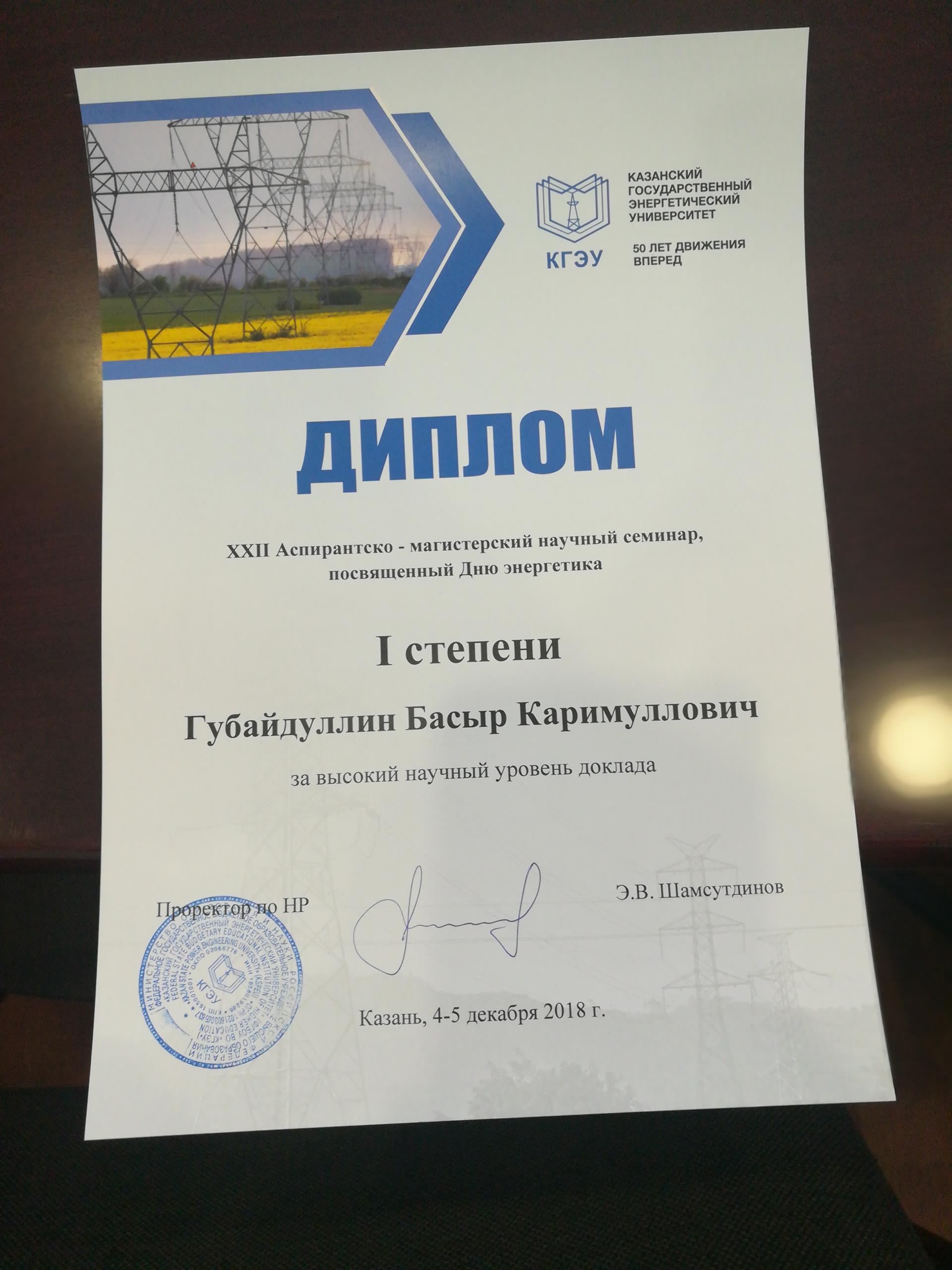 4-5 декабря прошел 12 Аспирантско- магистерский научный семинар посвященный Дню энергетика. Диплом 1 степени за доклад заслуженно получил Губайдуллин Басыр ЭП-2-14.