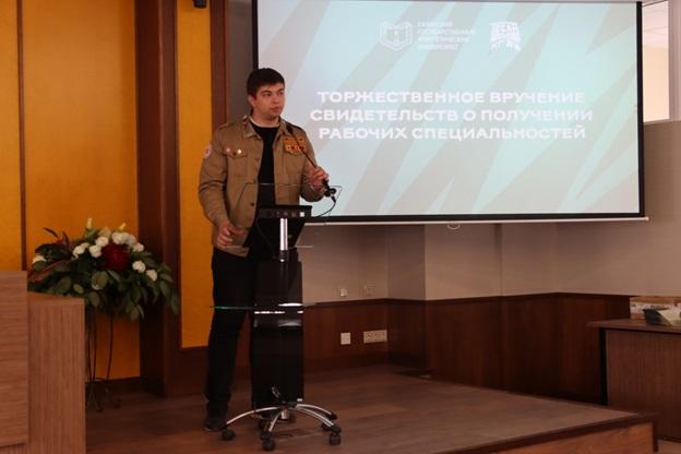 Перед собравшимися выступил командир Казанского штаба студенческих отрядов Аяз Хусниев, он пожелал ребятам влиться в большую стройотрядовскую семью КГЭУ, отработать летнюю трудовую смену в составе одно из отрядов штаба ССО «Тесла», испытать себя в выбранной профессии и, конечно же, немного заработать. В завершение Аяз Хусниев вручил студентам свидетельства о профессии рабочего.