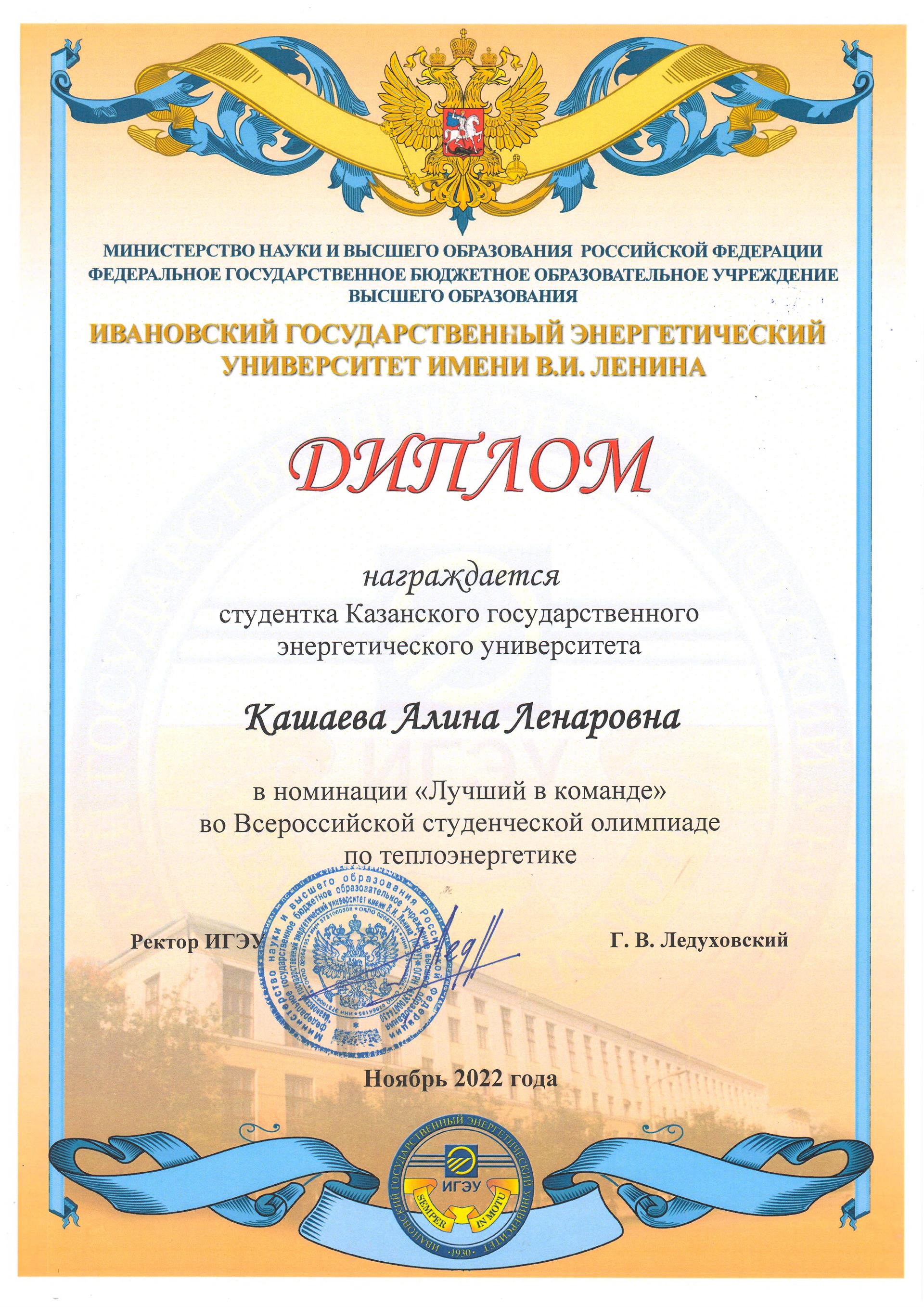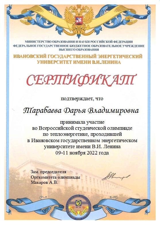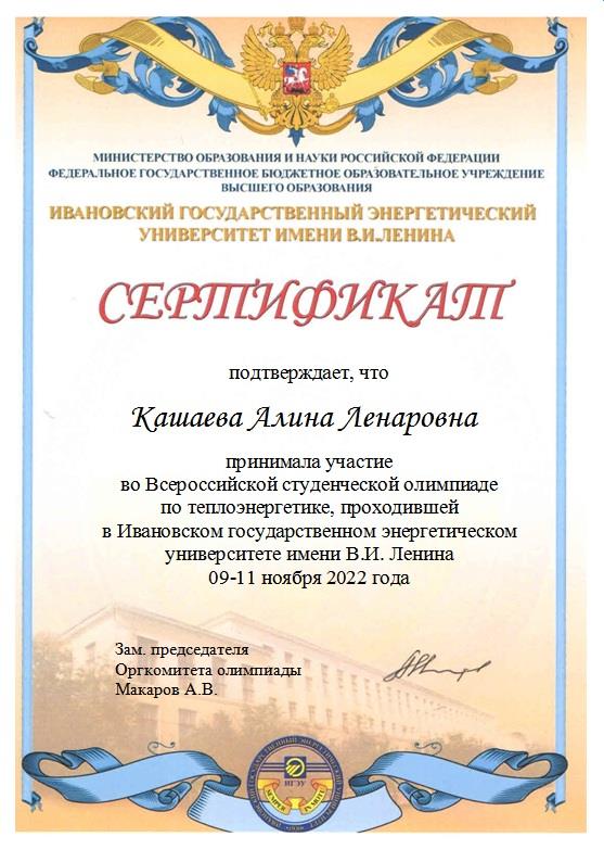Участники Олимпиады соревновались в командной интеллектуальной игре по теплоэнергетике и решении задач. От КГЭУ в олимпиаде по теплоэнергетике приняли участие студенты Института теплоэнергетики Кашаева Алина, Тимершин Азат, Шарафиев Дмитрий, Тарабаева Дарья, Клюкин Илья и сопровождающий их доцент кафедры ПТЭ Валиев Радик Нурттинович. По итогам проверки олимпиадных работ студенты кафедры «Промышленная теплоэнергетика и системы теплоснабжения» Казанского государственного энергетического университета Кашаева Алина, Тимершин Азат, Шарафиев Дмитрий были награждены дипломом за 3-е командное место. Отдельным дипломом была награждена студентка группы ПТС-1-19 Кашаева Алина, как лучшая в команде. По итогам проведенных олимпиадных мероприятий ректор ИГЭУ Ледуховский Григорий Васильевич направил в адрес ректора КГЭУ Абдуллазянова Эдварда Юнусовича благодарственное письмо, в котором выразил благодарность за организацию участия студентов КГЭУ в олимпиаде по теплоэнергетике.