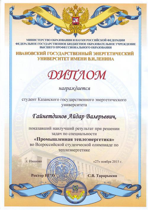 В личном зачете студент кафедры ПТЭ Гайнетдинов Айдар Валерьевич показал наилучший результат при решении задач по специальности «Промышленная теплоэнергетика».