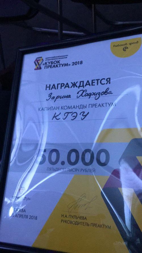 Результатом конкурса стала победа студентки 3 курса КГЭУ Зарины Хафизовой - резидента Российско-Китайского молодежного бизнес-инкубатора КГЭУ, активной участницы программ Российского союза молодежи и руководителя проекта "KeLin". Зарина стала лучшим капитаном Преактум со всей России! Поздравляем Зарину и ребят и желаем успехов в реализации проектов!