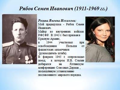 Майор Рябов Семен сопровождал поезд, в котором И.В. Сталин добирался на Ялтинскую конференцию Союзных Держав.