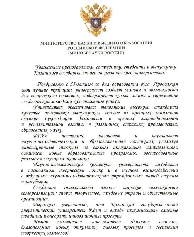 Поздравление Министерства образования и науки Российской Федерации